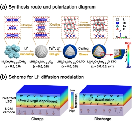 随着纯电动/混合电动汽车对高能量密度锂离子电池需求的不断增加,富镍层状正极材料(NCM)被广泛应用,然而其在长循环中出现的性能退化及安全隐患亟待解决。白莹教授课题组采用简单、易行的制备方法,在NCM正极表面构筑压电包覆层,实时将循环中NCM二次颗粒内部的应力应变转化为周期性变化的界面局域电场,协同参与调控电极-电解质界面处Li+的输运行为,有效提升了相变可逆性。同时,压电包覆层可缓解NCM晶格变化,稳定其力学性能,抑制粒内/粒间裂纹,减少电极-电解质界面副反应发生。该研究工作为稳定锂离子电池正极材料晶体相变和改善固液界面性能提供了新的研究思路和技术手段。