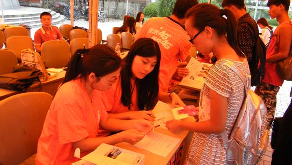 学院在物理楼B楼前设置了新生报到区、缴费区、家长休息区、免费饮水点,流程清晰,秩序井然。迎新工作人员当场向学生及家长介绍学院情况、专业情况、学习活动等方面情况,介绍国家和学校有关资助政策,为家庭经济困难学生办理了“绿色通道”手续,确保他们都能顺利入学。各系还安排了志愿者全程服务新生,新生及家长在志愿者的引导下,能顺利依次完成报到、缴费、入住寝室等各个环节。