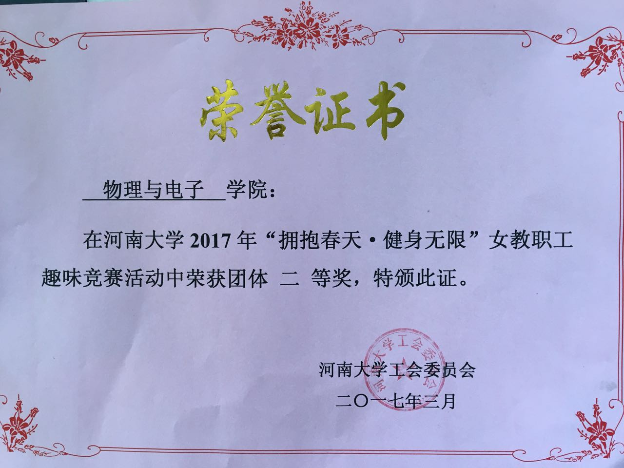 3月2日下午,由太阳城集团官方网站工会主办的“拥抱春天·健身无限”女教职工趣味竞赛在明伦校区如期举行,太阳城官网代表队在院党委书记王宏华,院党委副书记乔石豪、工会主席邱永宽的带领下积极参加各比赛项目,在跳大绳比赛中荣获二等奖。