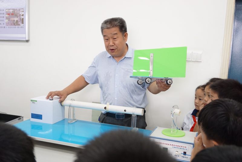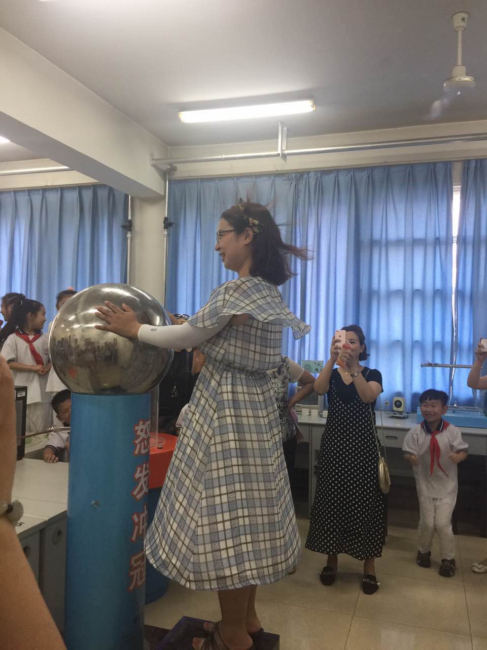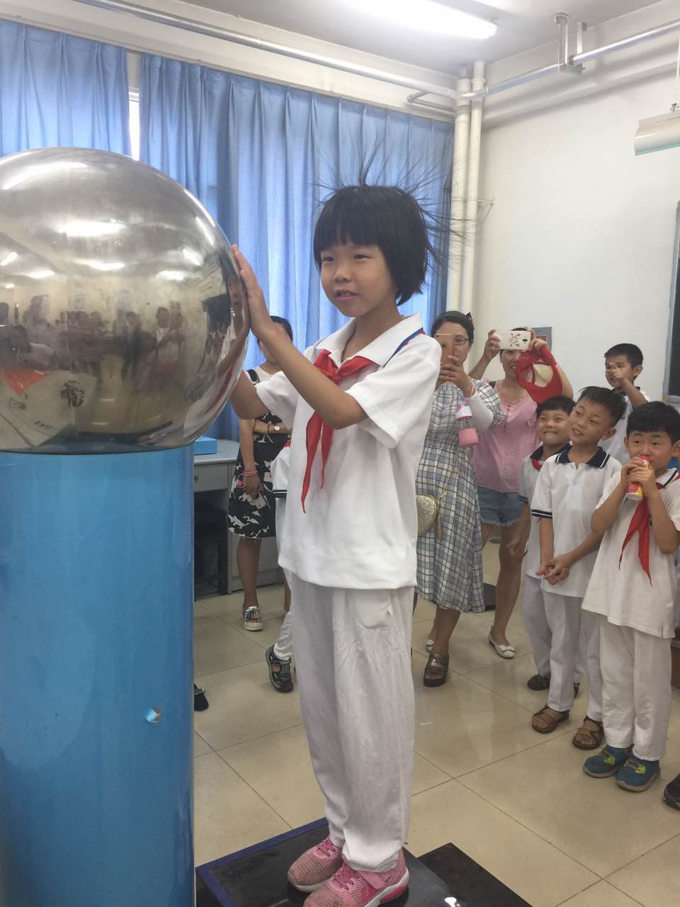 小学生们首先来到了物理演示实验室,刘平安副教授给同学们演示了水神奇的表面张力现象、水驻波实验,观看了共振小娃、电谐振、静电感应等等有趣的实验……老师生动的讲解使小朋友们都沉浸在科学的奇妙现象之中。当小学生们在10万伏的静电作用下“怒发冲冠”时,都惊呆了,争抢上去实验,就连一些家长也要上去补上在难得一见的体验!
