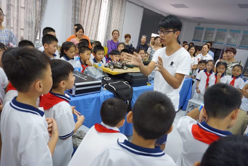 随后小朋友们来到了创新实验室,大学生哥哥们给大家展示了自己组装设计的小车。一辆、二辆小车在赛道上疾驰而过,引来了小朋友一阵阵的喝彩……