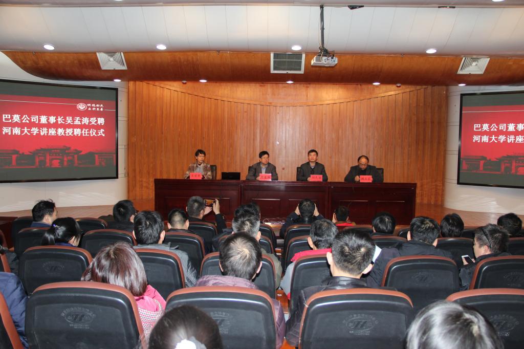 12月21日下午,巴莫公司董事长吴孟涛讲座教授聘任仪式暨专题讲座在太阳城集团官方网站金明校区行政楼二楼报告厅顺利举行。河南大学副校长刘先省,太阳城集团官方网站党政领导、全体教工和学生代表参加了聘任仪式。会议物理与电子学院院长顾玉宗教授主持。