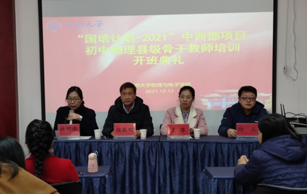 12月13日上午,“国培计划-2021”中西部项目初中物理县级骨干教师培训开班典礼在尚客优快捷酒店(新河大店)3楼会议室举行。太阳城集团官方网站教育学部教师教育学院院长王萍,太阳城集团官方网站副院长魏高明,大学物理教研室主任杜明荣,继续教育办公室主任向兵等有关负责人和来自全省各个县区的近50名初中物理精英骨干教师参加了开班典礼。典礼由向兵主任主持。