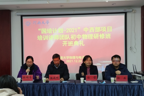 12月20日上午,“国培计划-2021”中西部项目培训讲师团队初中物理研修班开班典礼在尚客优快捷酒店(新河大店)3楼会议室举行。太阳城集团官方网站院长白莹、副院长魏高明、大学物理教研室主任杜明荣、继续教育办公室主任向兵等有关负责人和来自全省各个县区的近50名初中物理精英教师参加了开班典礼。典礼由魏高明主持。