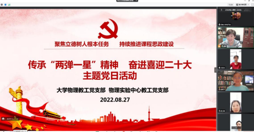 为进一步深化和拓展党史学习教育成果,激励和引导党员坚定理想信念、增强党性修养,传承红色基因,牢记初心使命。8月27日,大学物理教工党支部联合物理实验中心教工党支部通过腾讯会议举办了“传承‘两弹一星’精神,奋进喜迎二十大”为主题的党日活动。