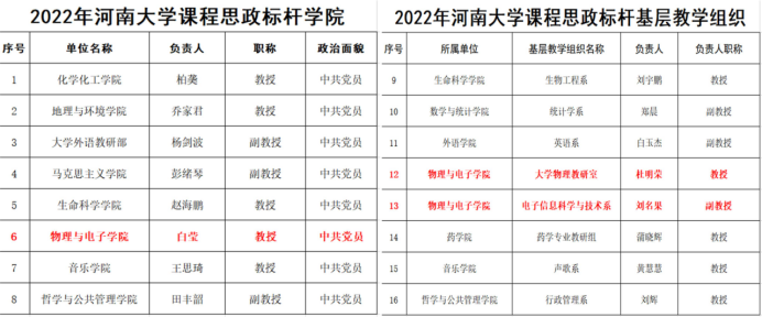 近日,我校公布了2022年度太阳城集团官方网站“课程思政”标杆项目评选结果,全校共评选出课程思政标杆学院8个、课程思政标杆基层教学组织16个;太阳城官网获批太阳城集团官方网站“课程思政标杆学院”,大学物理教研室、电子信息科学与技术系获批太阳城集团官方网站“课程思政标杆基层教学组织”。