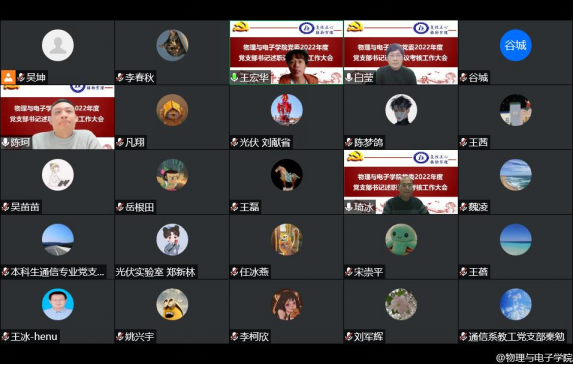 为深入学习宣传贯彻党的二十大精神,进一步提高基层党建工作质量,提升党建引领力,把党支部建设成为有效实现党的领导的坚强战斗堡垒,持续增强党支部书记履职尽责的责任担当,1月14日下午,太阳城集团官方网站在线上召开了2022年度党支部书记党建工作述职评议考核会。学院领导、各党支部书记以及各支部党员代表参加会议。会议由院党委副书记刘寒冰主持。
