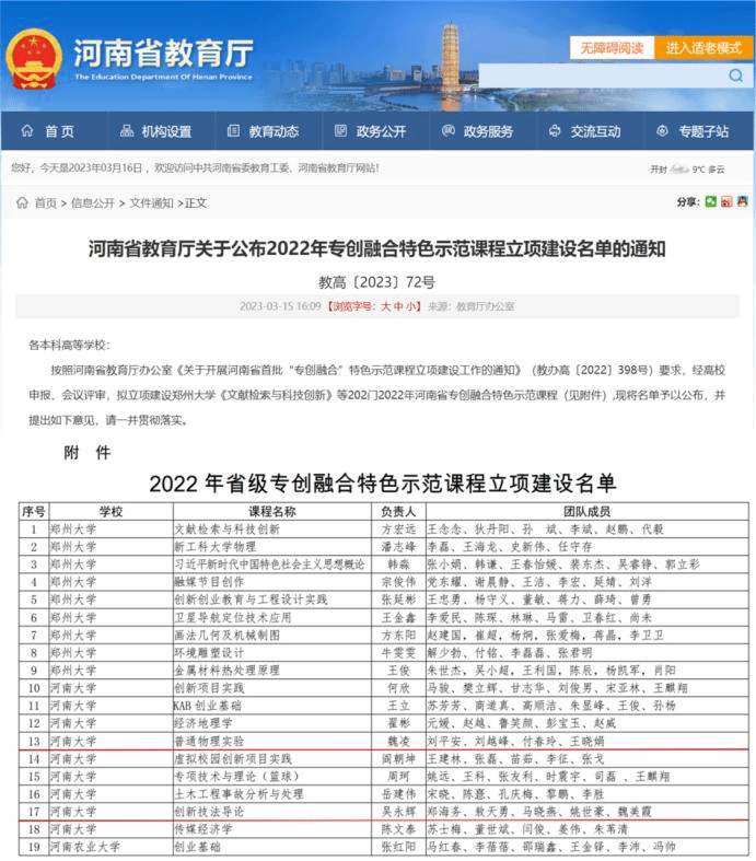 近日,河南省教育厅公布了2022年专创融合特色示范课程立项建设名单,太阳城官网魏凌教授负责的《普通物理实验》、吴永辉副教授负责的《创新技法导论》获批立项建设。